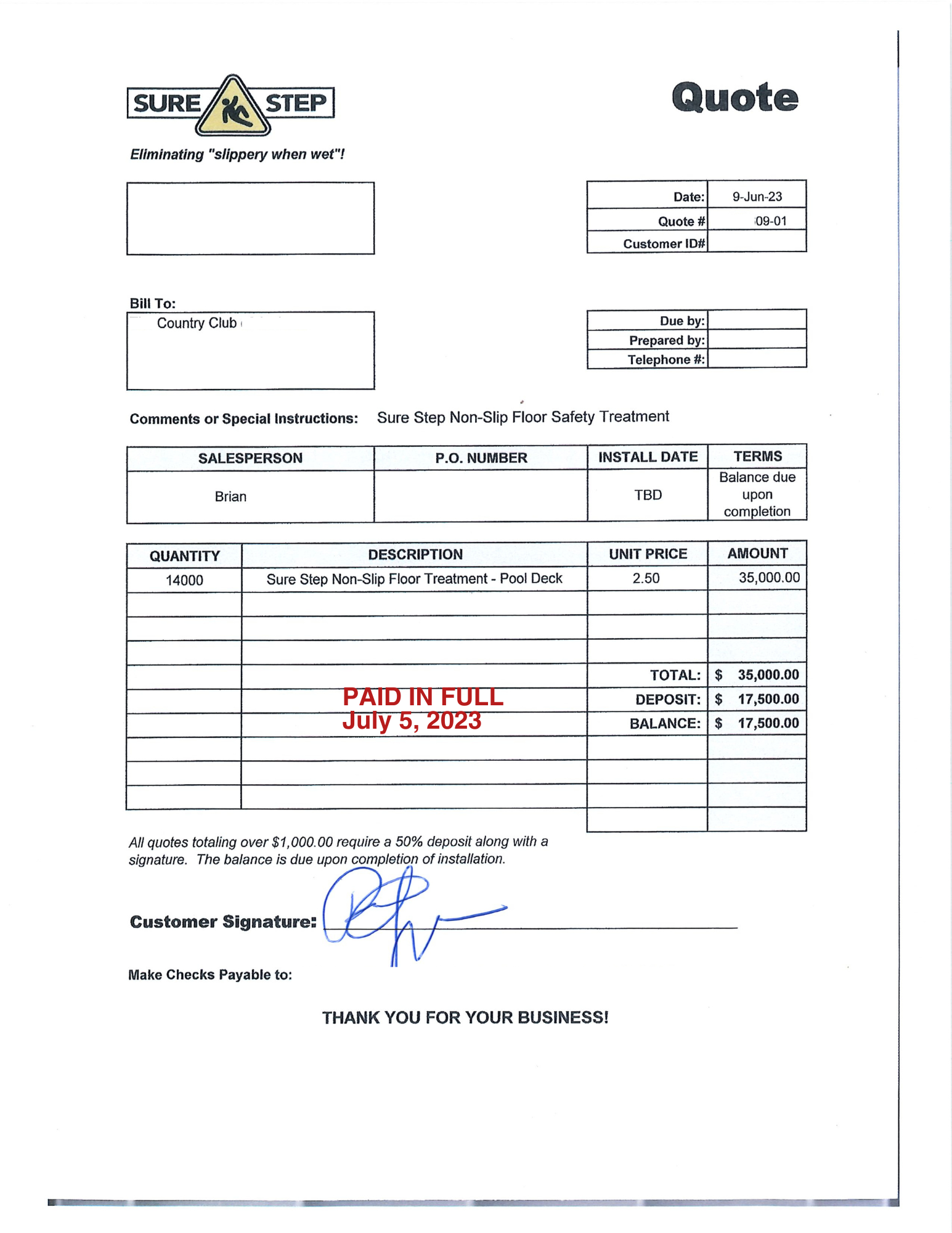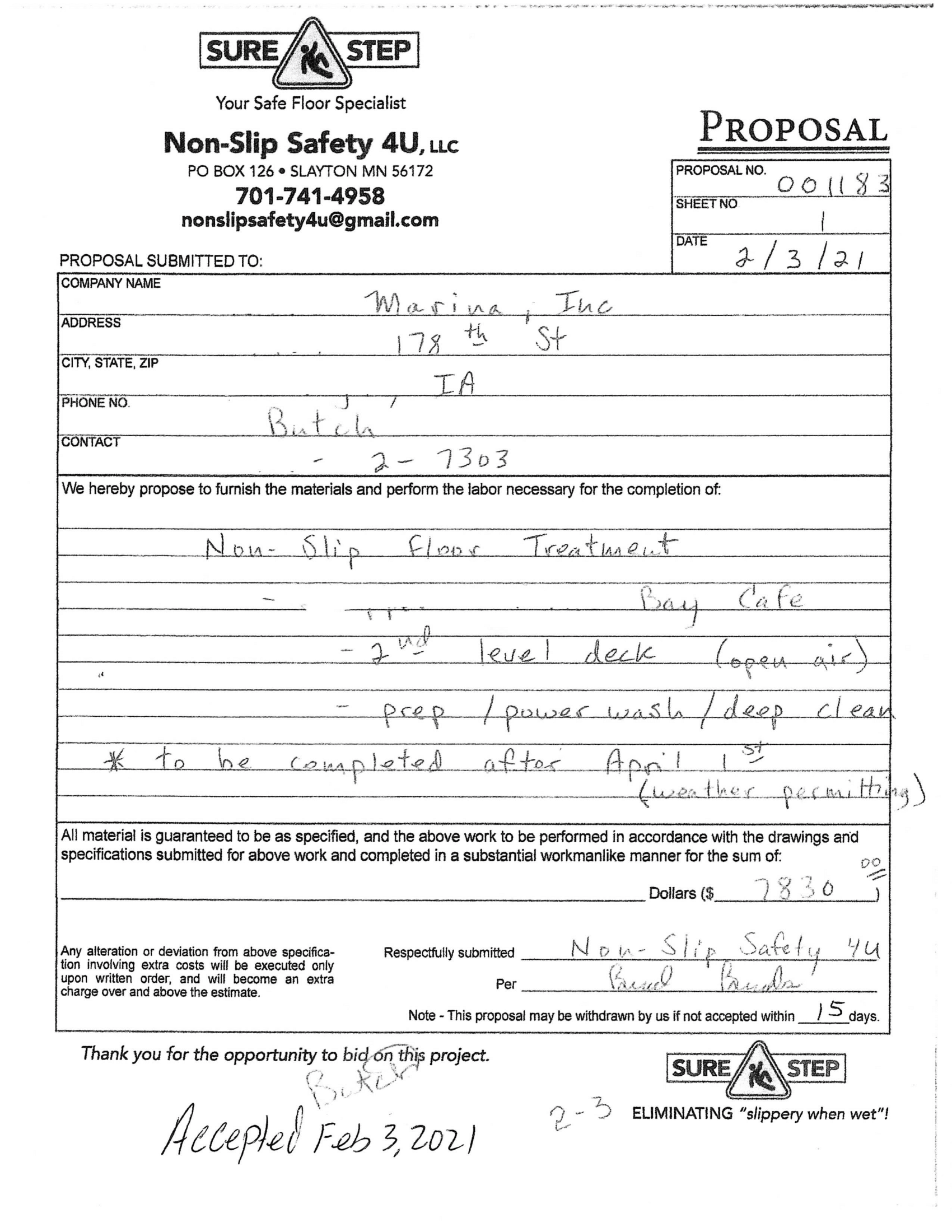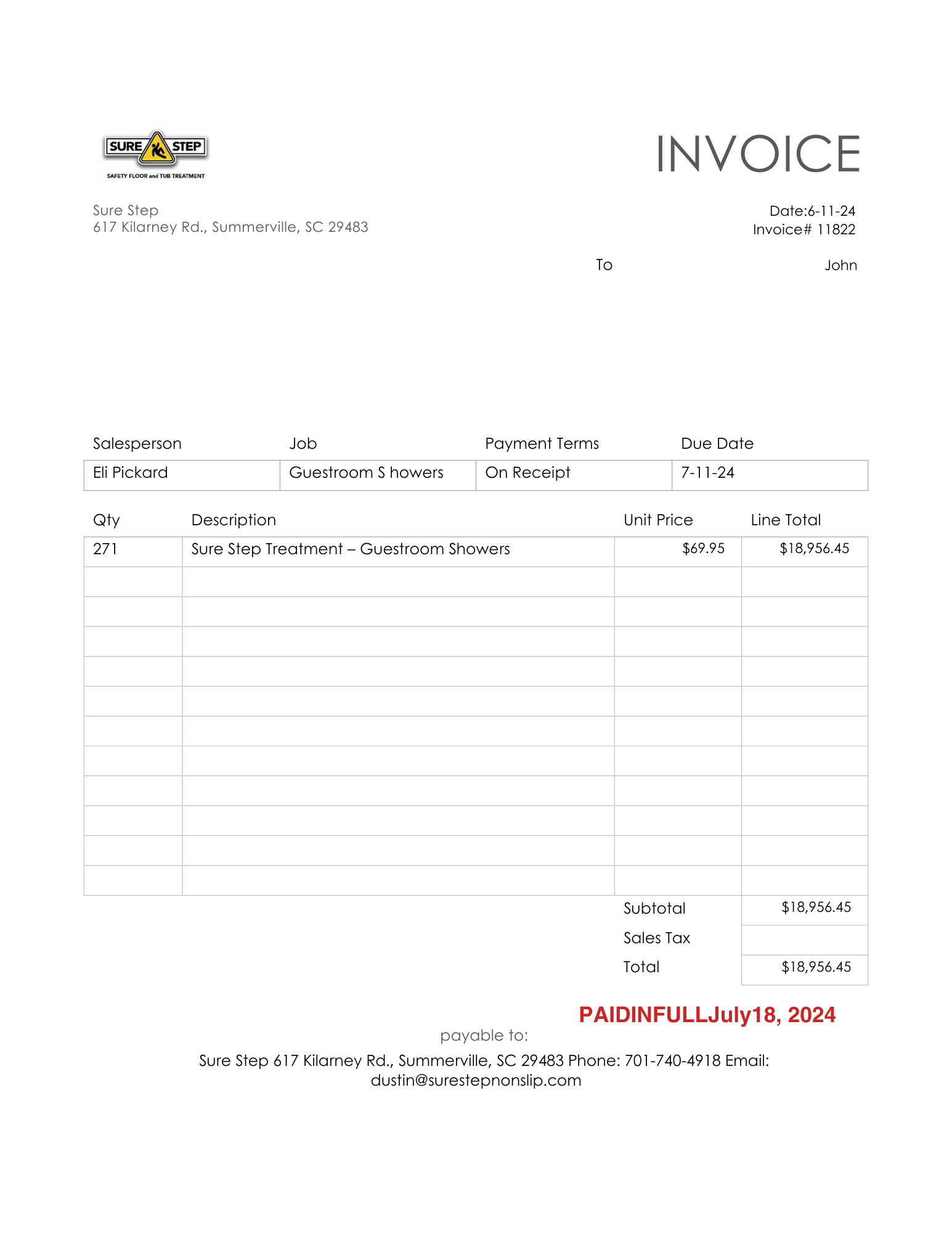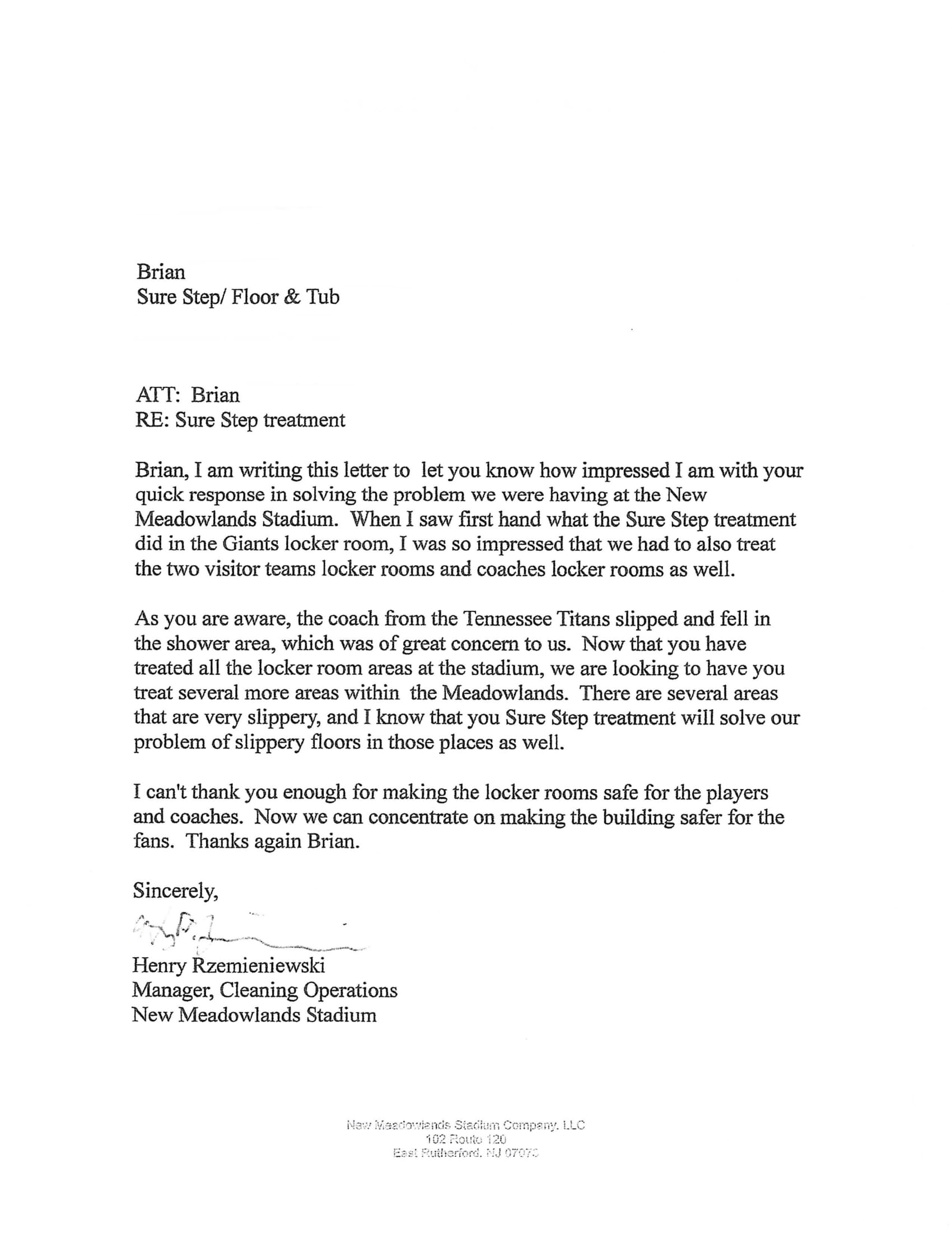 Our outing in the field was extremely positive with our very first stop. We walked in to the Holiday Inn, and once introducing ourselves, we were instructed to meet the maintenance director who stated they had issues with their bathtubs. We proceeded to a vacant room and treated one porcelain bathtub. No cost of course. ‘Mike’ was so impressed, and said he’d have the GM & owners inspect to give Brian the green light to do all 132 rooms. Next stop was the stadium, where once again we were greeted warmly. They had outdoor areas needing Sure Step, as well as 3 kitchens. After a few other stops, we found ourselves at the Courtyard Marriott where one family group own all 4 divisions of the Marriott brand, also including the La Quinta, Tru by Hilton, Hampton Inn, Country Inn & Best Western brands...22 hotels total!!! All family operated, and we were told if one liked our product, all would follow suit. We were instructed to give a one time lowest possible price and they would consider. So a proposal was issued verbally to start with one hotel and go from there. If they chose to do only a few hotels, then the price would increase. Brian is to issue a formal quote in the coming days once a start date was chosen. A VERY productive first day! Brian was pleased to say the least as he never imagined he would see such results so quickly.