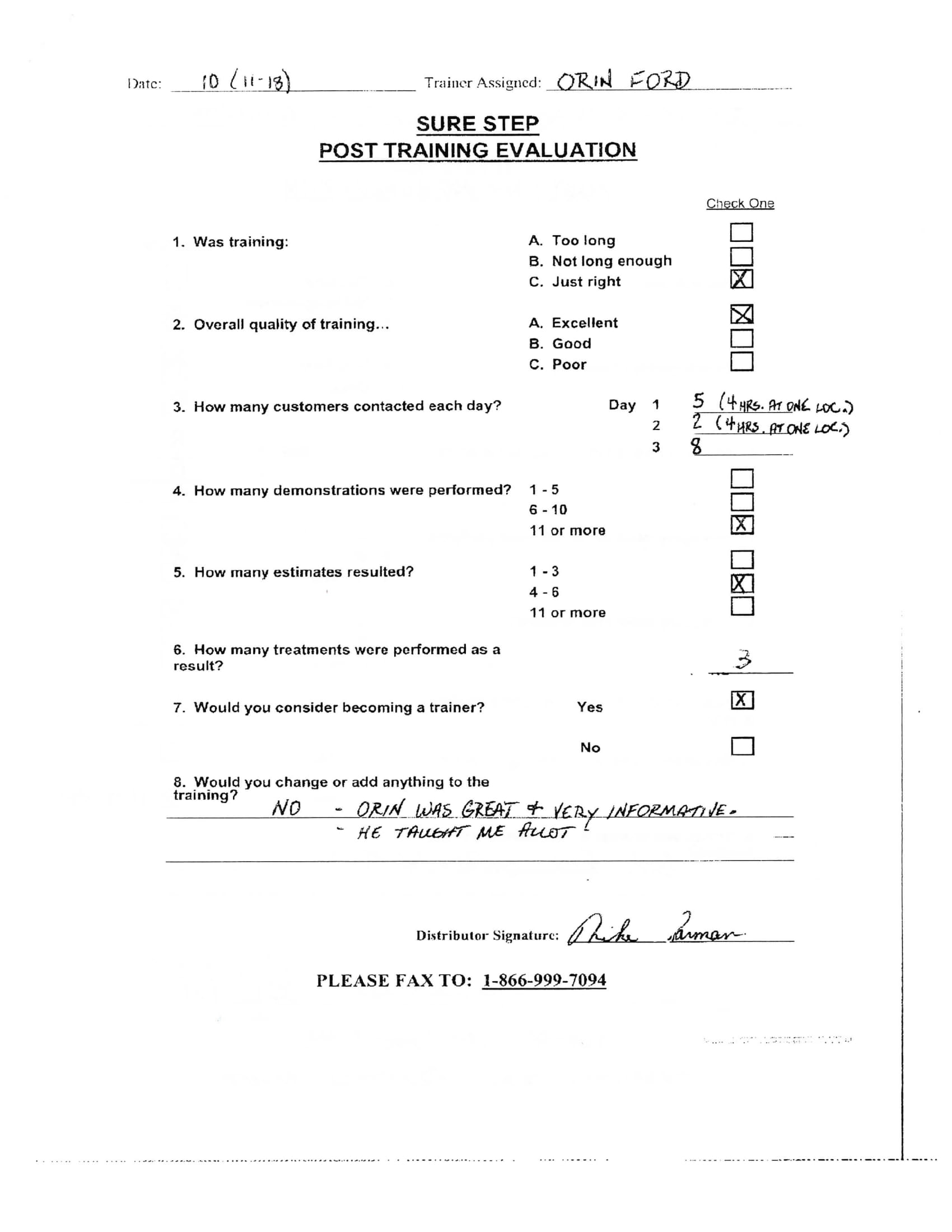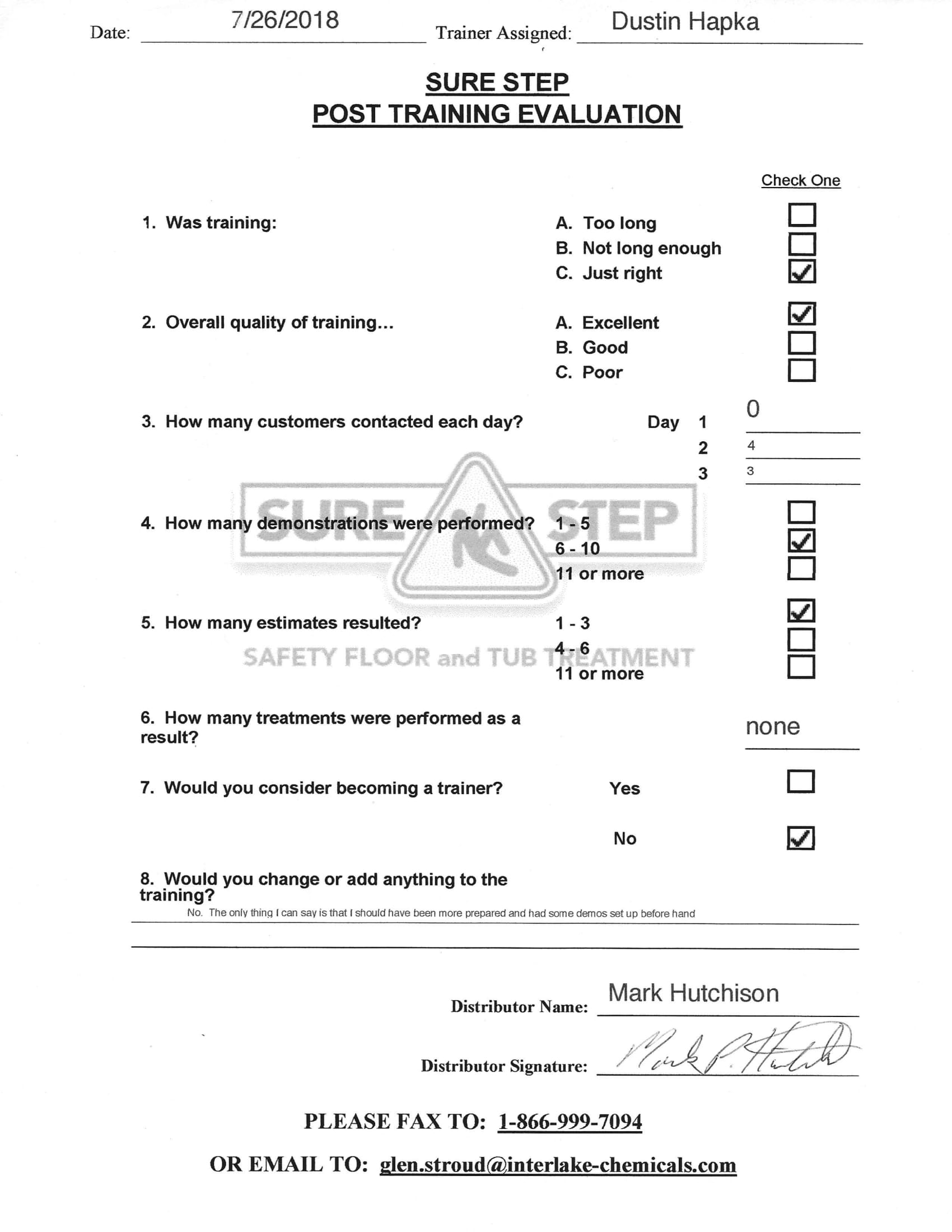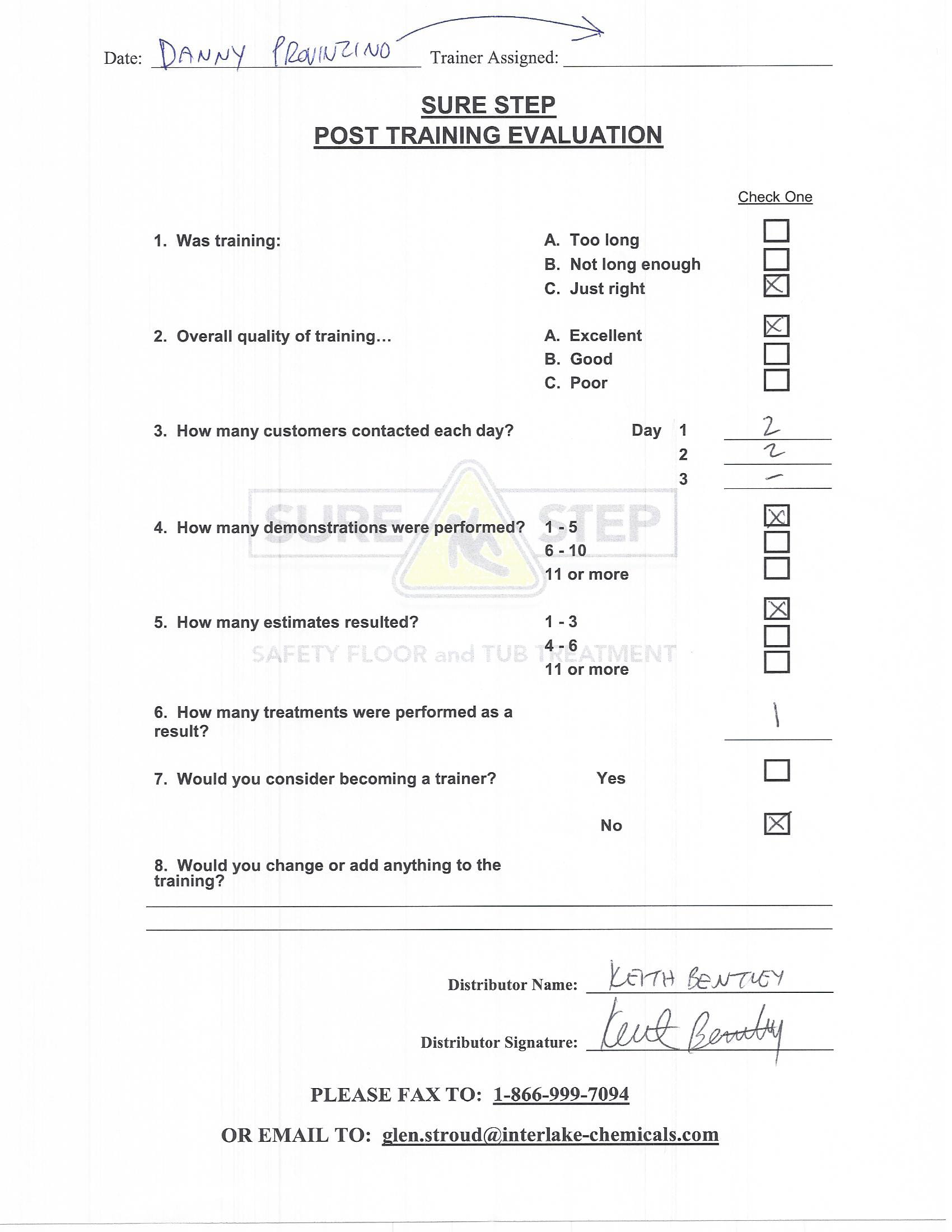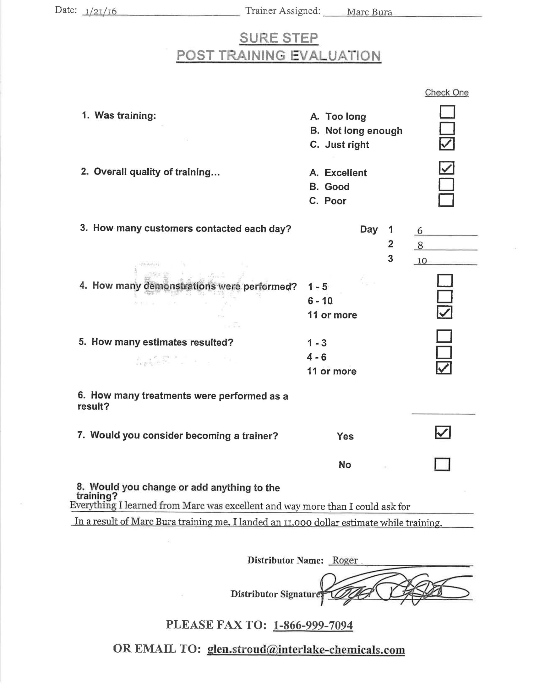 I was very happy with Brad and his training methods; I wanted to focus primarily on product and application knowledge and secondarily on sales techniques. To the former, I feel comfortable with what I have learned, and to the latter, it was amazing to me how easy it was to call on the businesses and have such a warm reception from the employees. They were quite curious and shocked by the Sure Step demonstration.