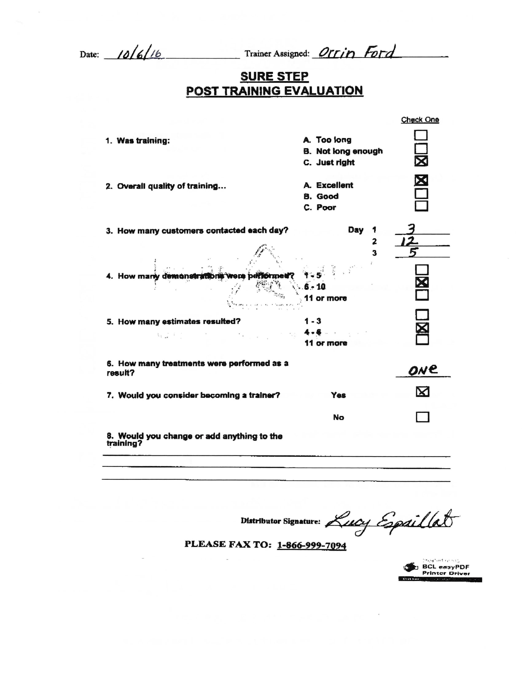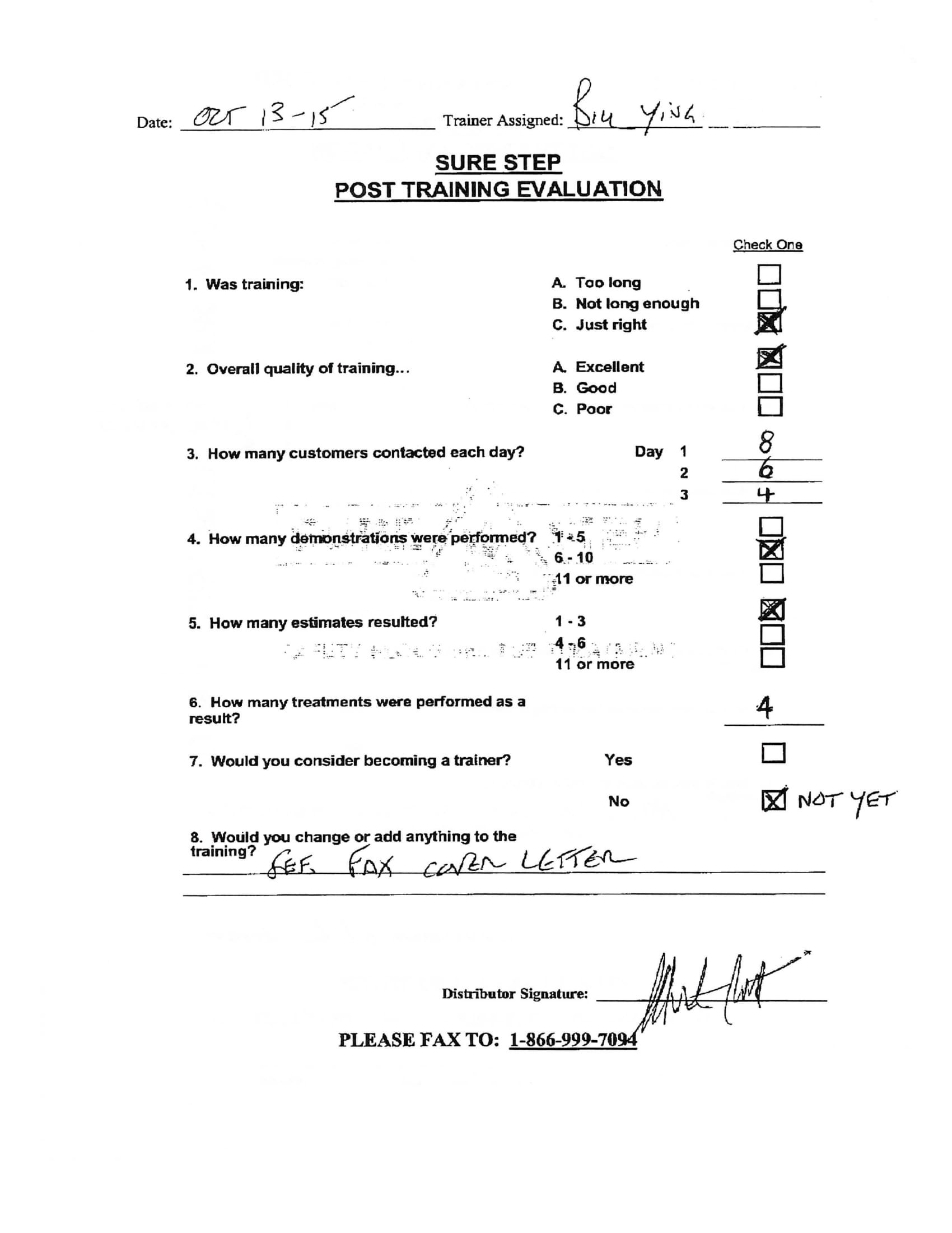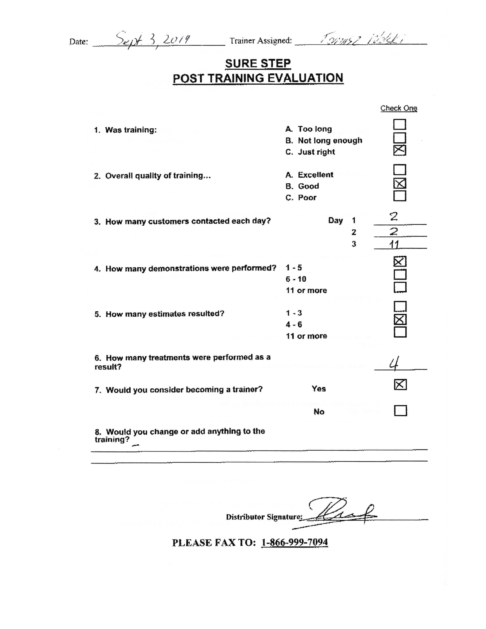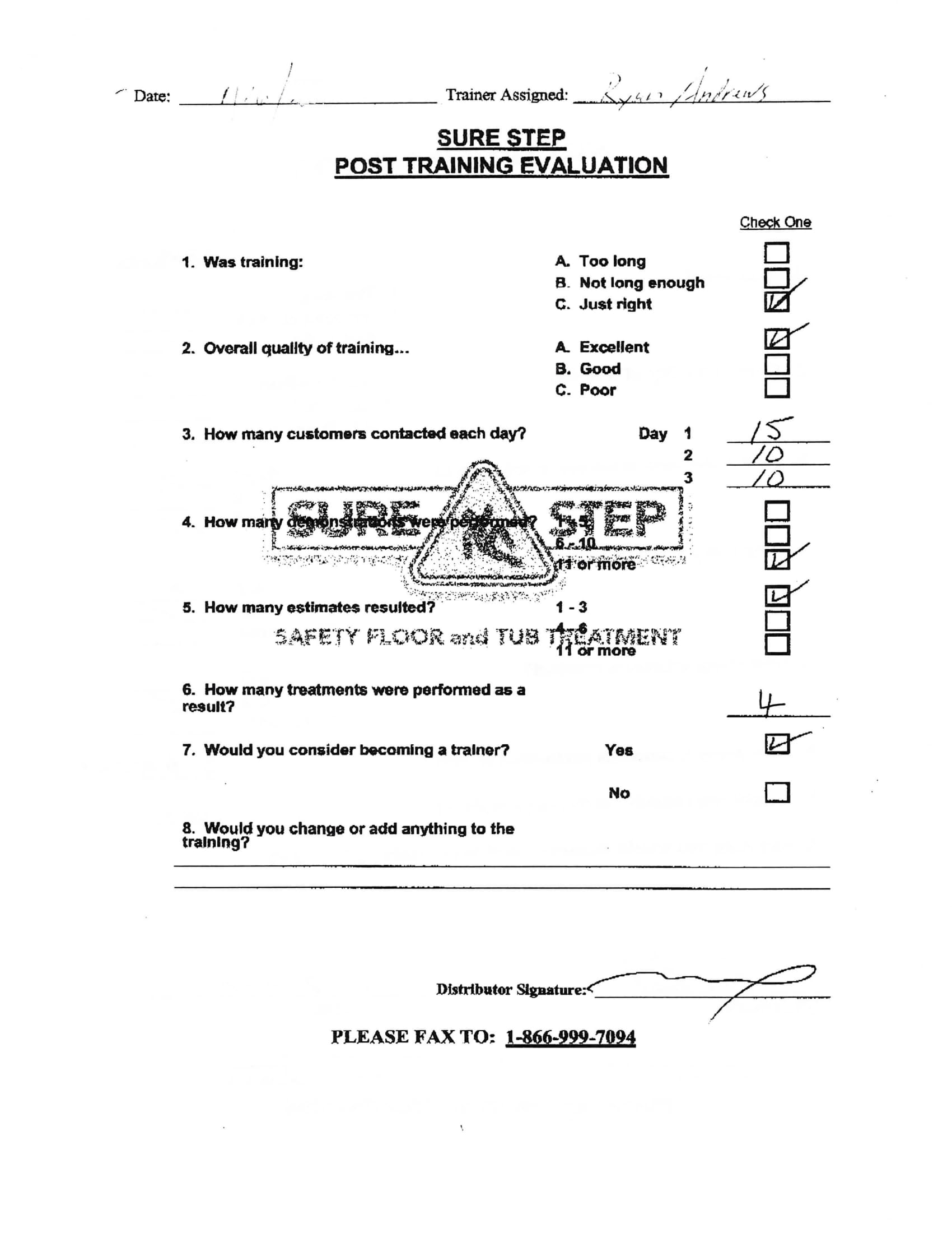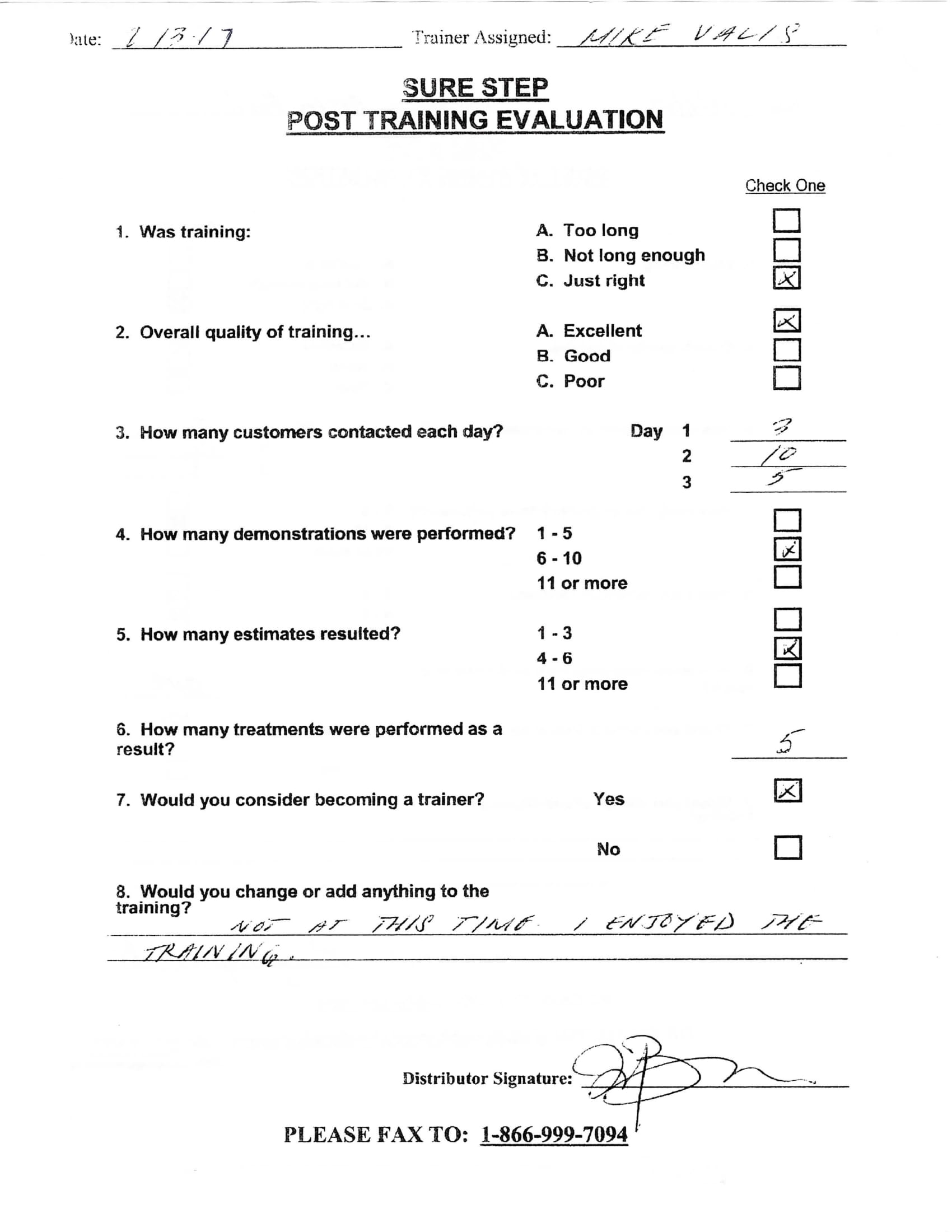 I was very happy with Brad and his training methods; I wanted to focus primarily on product and application knowledge and secondarily on sales techniques. To the former, I feel comfortable with what I have learned, and to the latter, it was amazing to me how easy it was to call on the businesses and have such a warm reception from the employees. They were quite curious and shocked by the Sure Step demonstration.